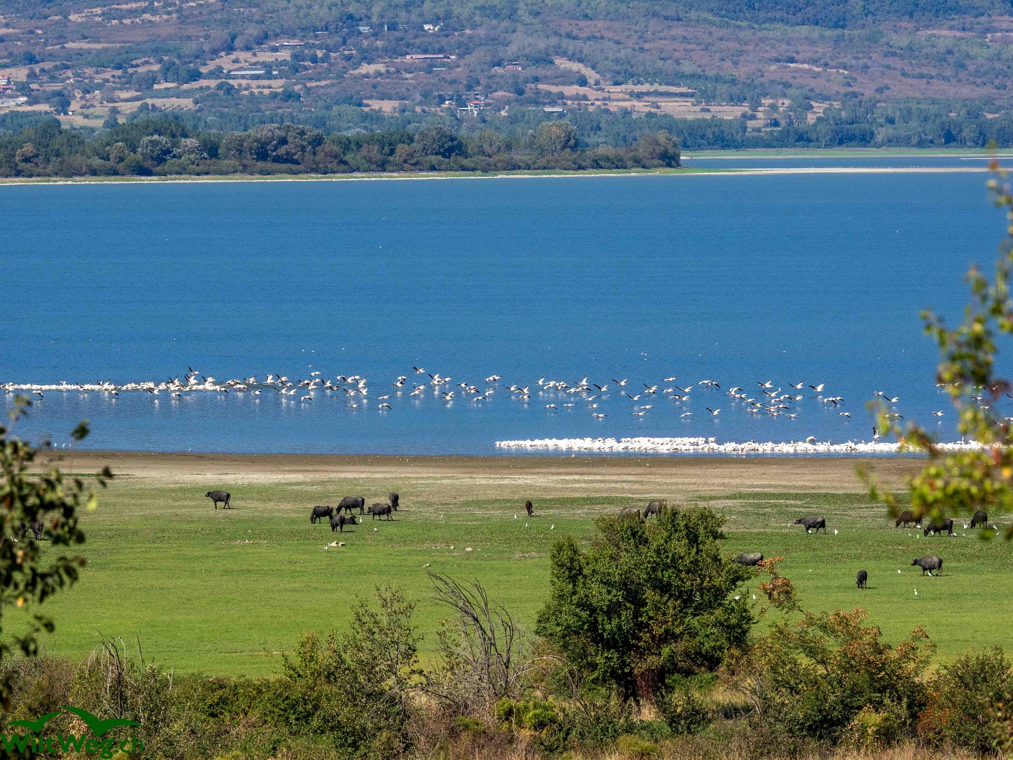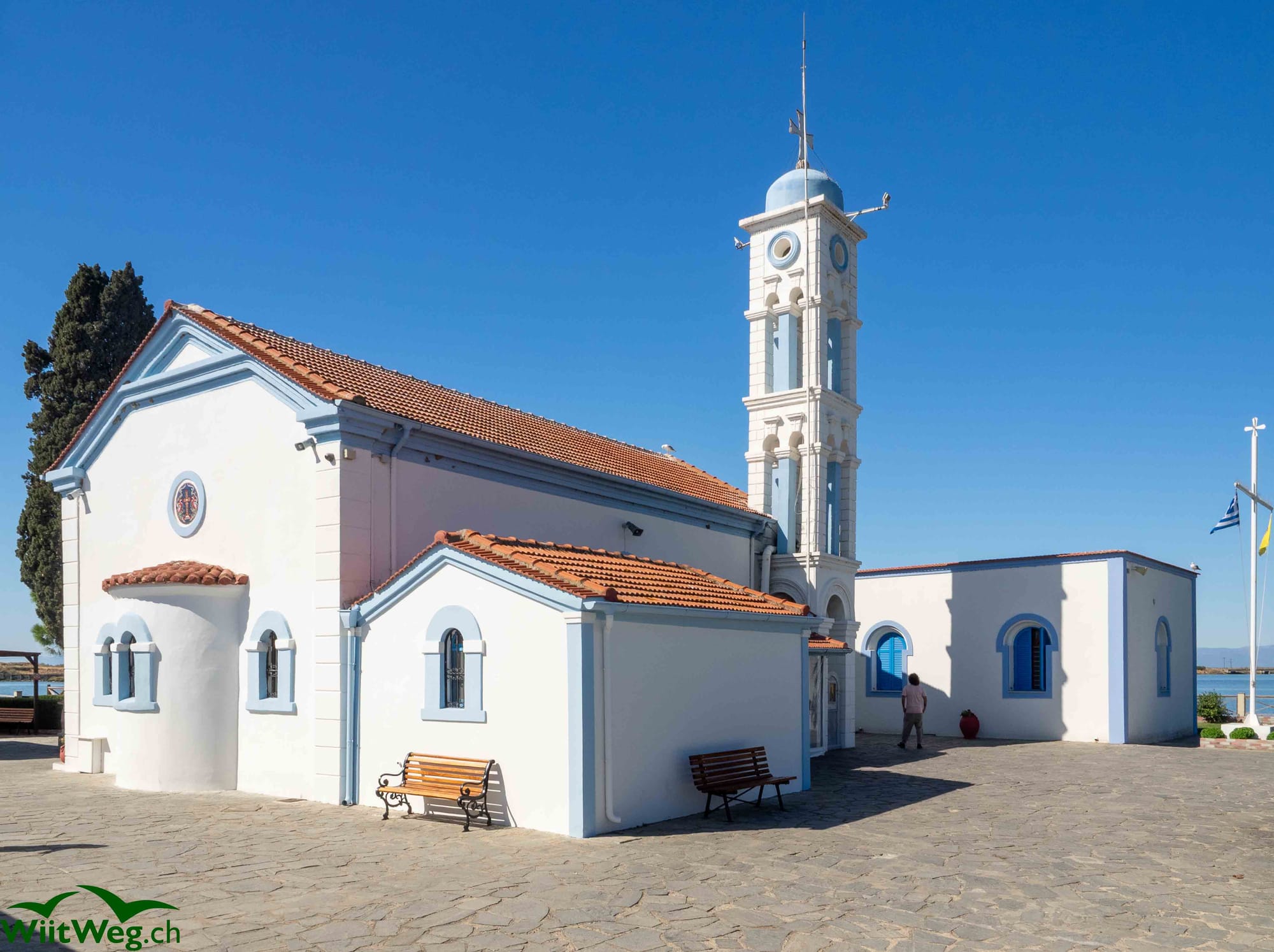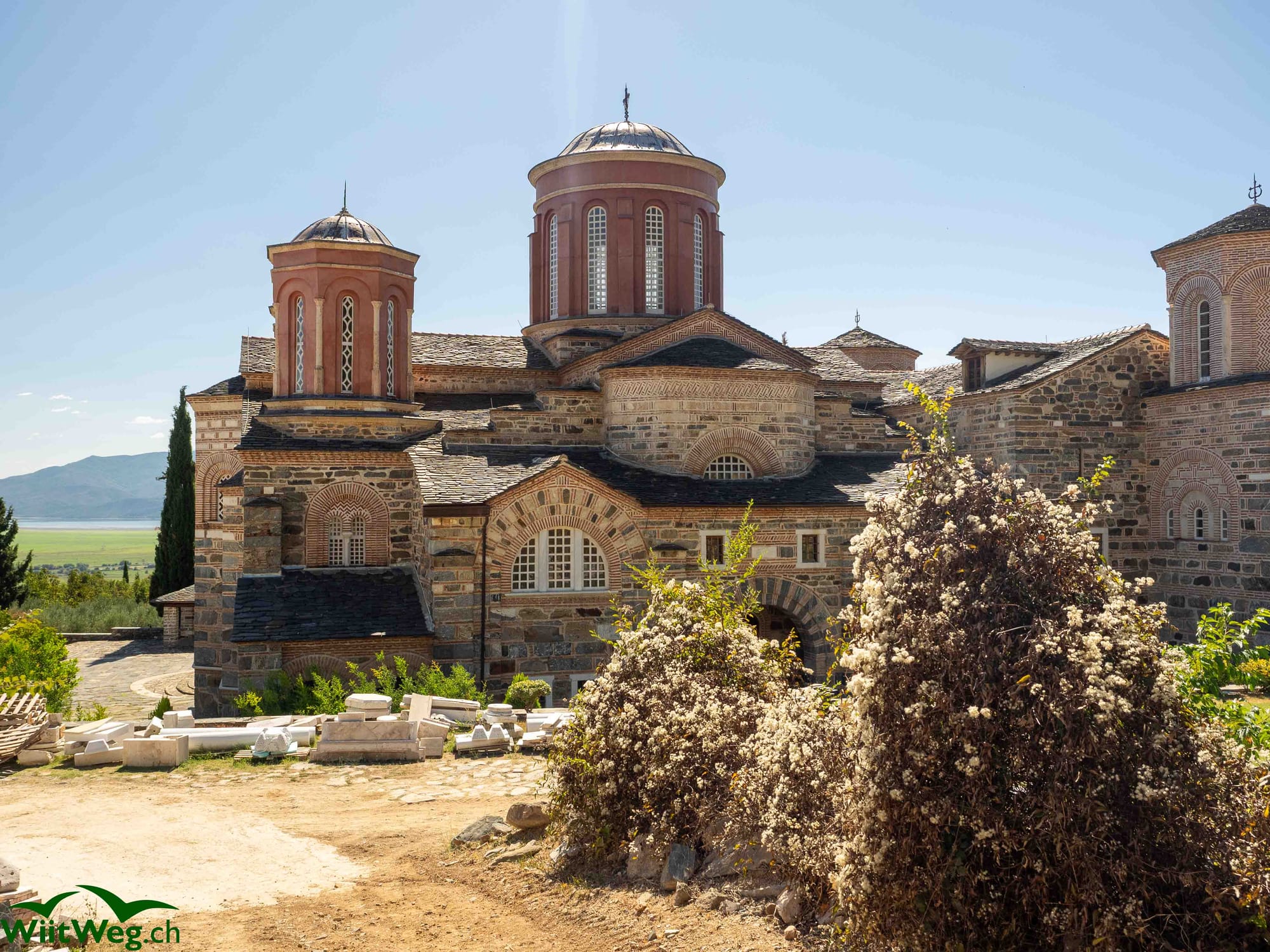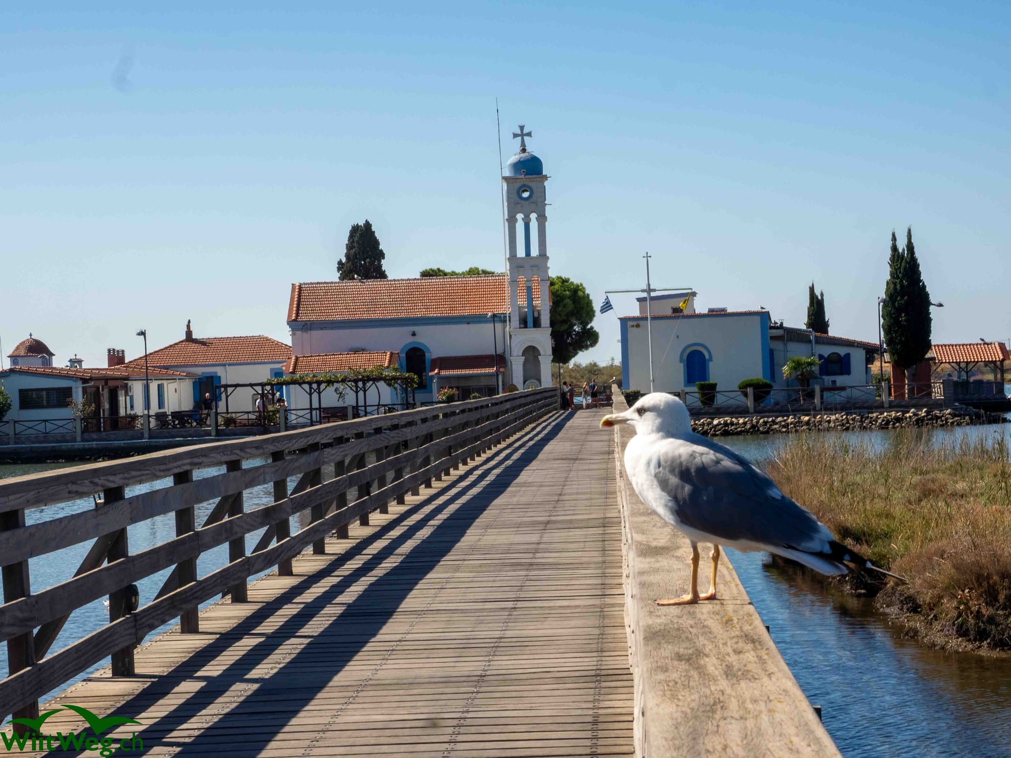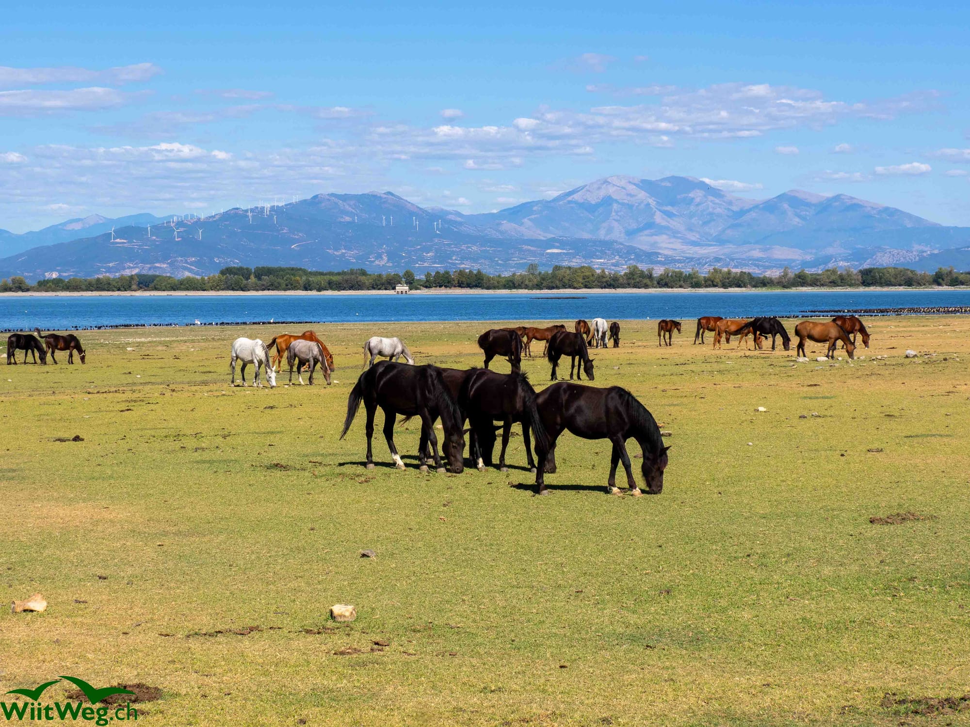 Ein Kloster in der Nähe des Kerkinisees und der See mit Pferden und Vögeln und ein musikalischer Stellplatz.