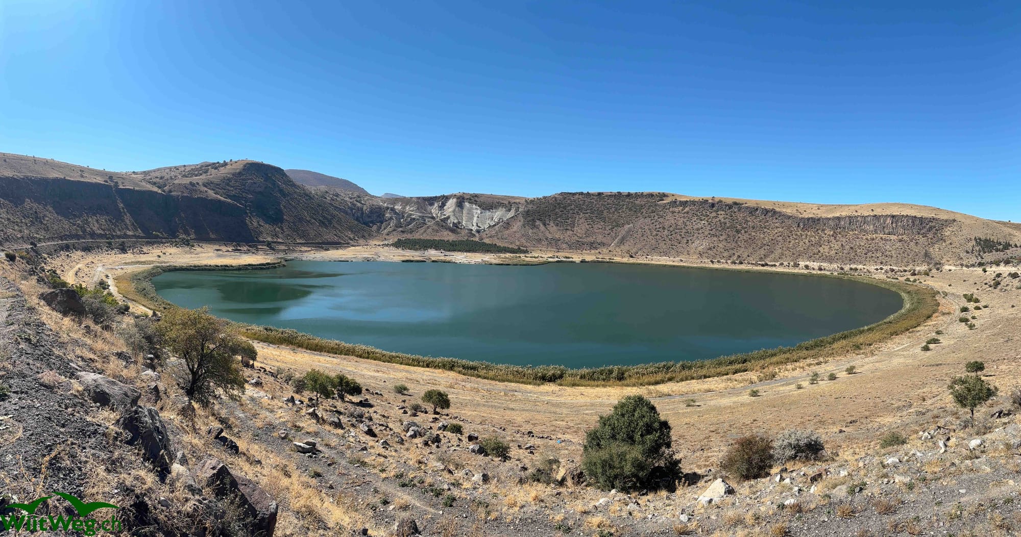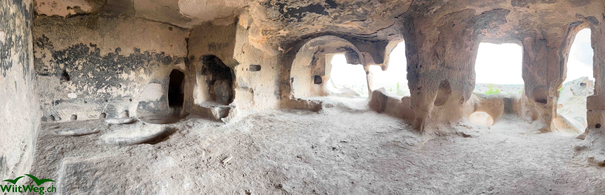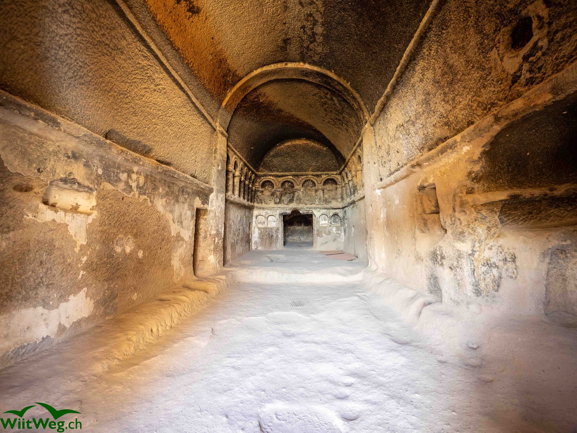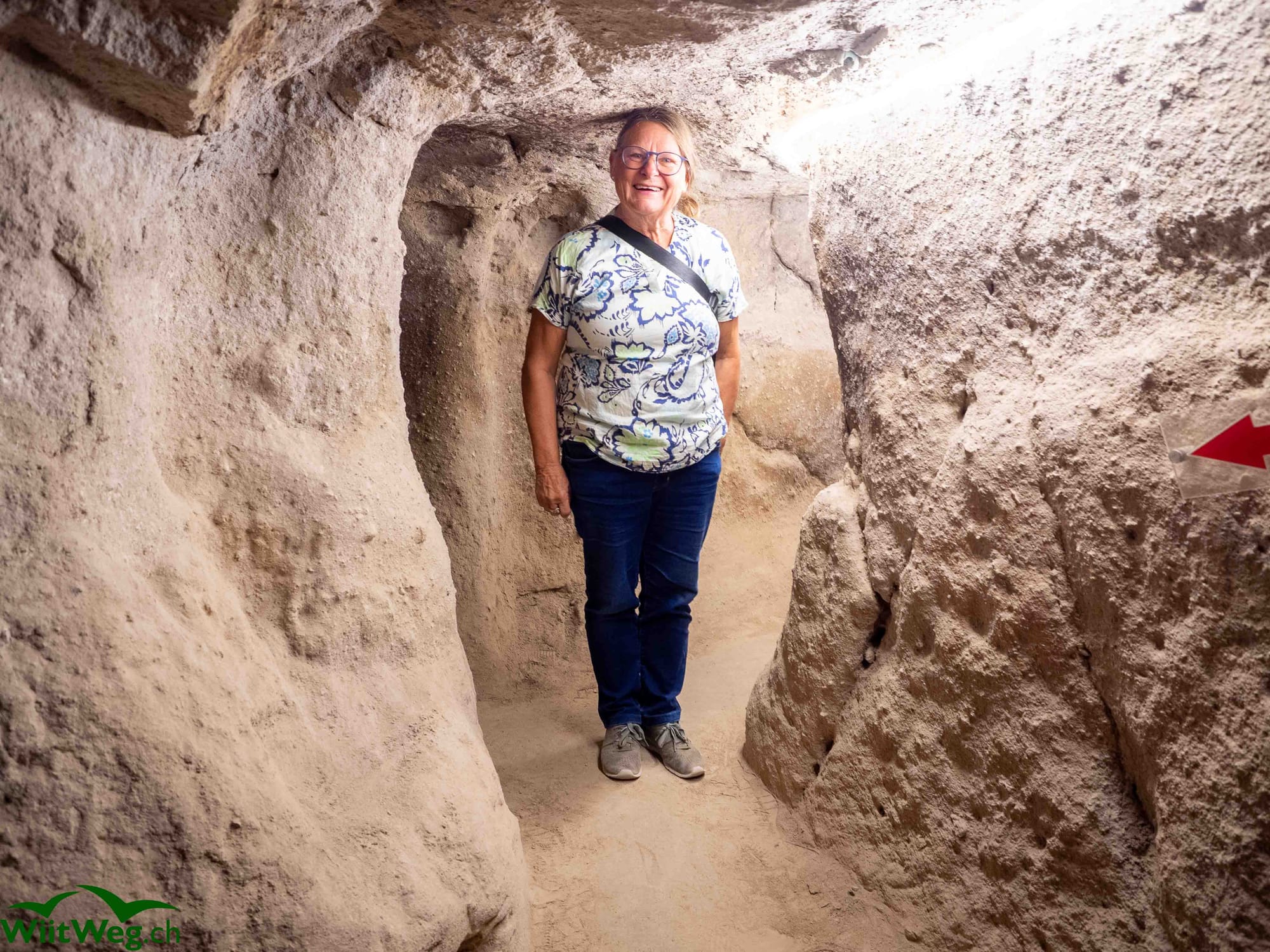 Weiterfahrt an einem Kratersee vorbei nach Mazi. Dort gibt es eine der in Kappadokien vorhandenen ehemaligen unterirdischen Städte. Diese im Untergrund in den Tuffstein gehauenen Behausungen mit teilweise sehr engen Tunnels und unzähligen Wohnzimmern, Küchen und Vorratsräumen.