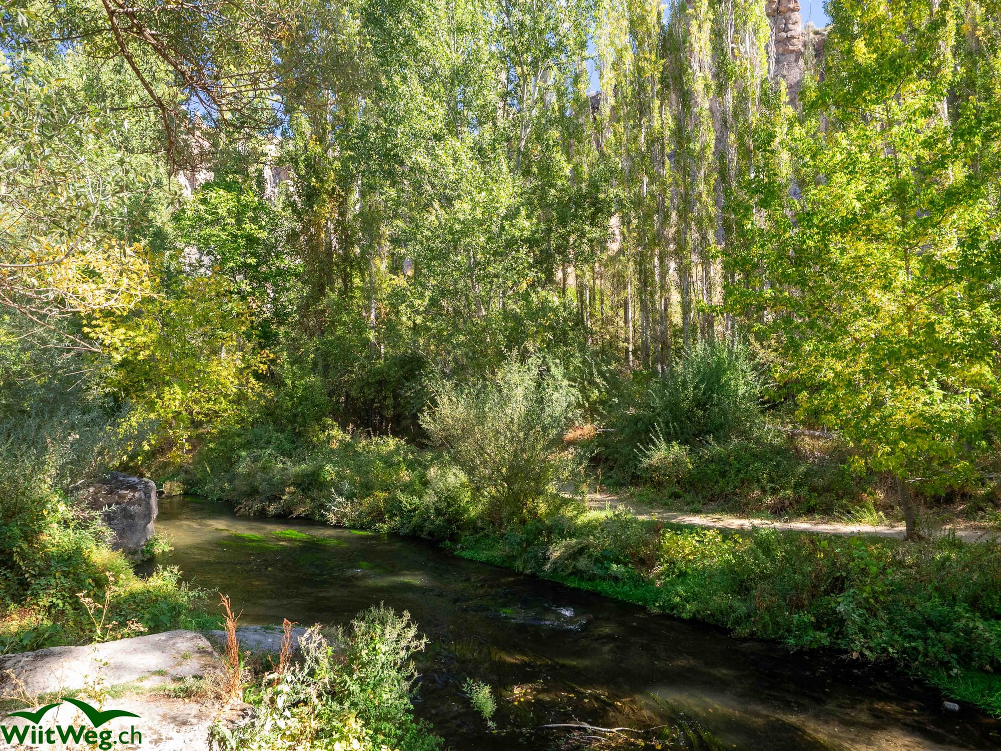 Mit einem Taxi sind wir von Selime nach Ihlara. Dort Abstieg über viele Treppenstufen in die bezaubernd idyllische Landschaft tief im Canyon. Auch dort gibt es in den Felsen gehauene Kirchen zu besichtigen. Mehrere Stunden wandern wir meist im Schatten von Bäumen und immer dem Flusslauf abwärts. Eine Pause mit frisch bereitetem Gözleme und die obligaten Çays mitten im Wald.