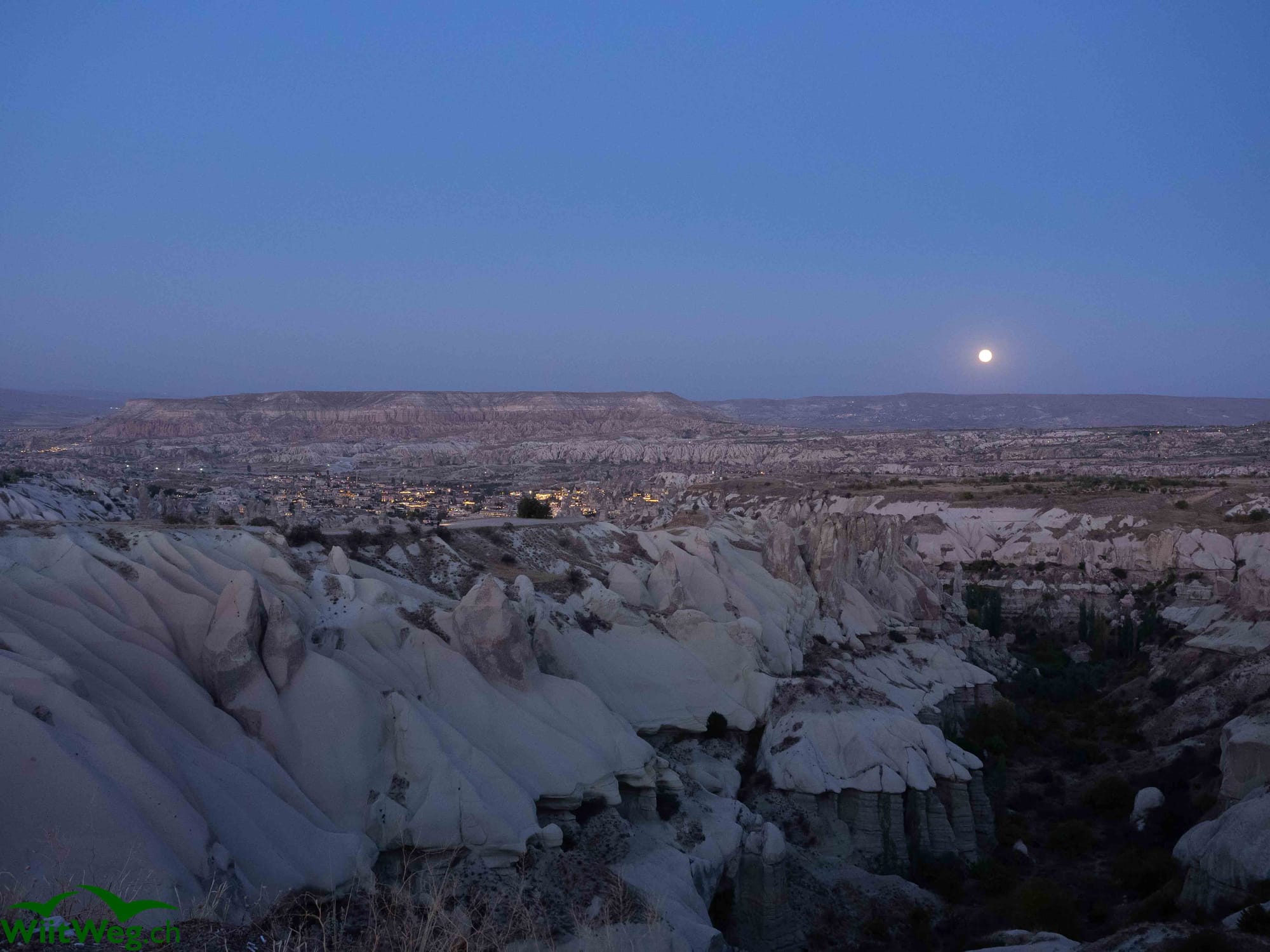Weiter nach Uchisar, einer der Städtchen nahe Göreme, dem touristischen Zentrum von Kappadokien. Verblüfft sehen wir in das Pigeon Valley mit für diese Gegend typischen Felsformationen und übernachten an der Abbruchkante dieses Tals und erleben einen Mondaufgang.
