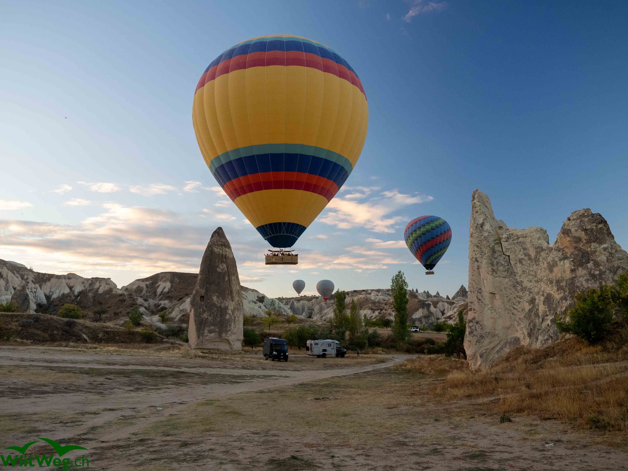 Neuer Übernachtungsplatz, neues schönes Ballon-Ballett und neue Wanderung im Love-Valley zu den Tuffstein-Gebilden.