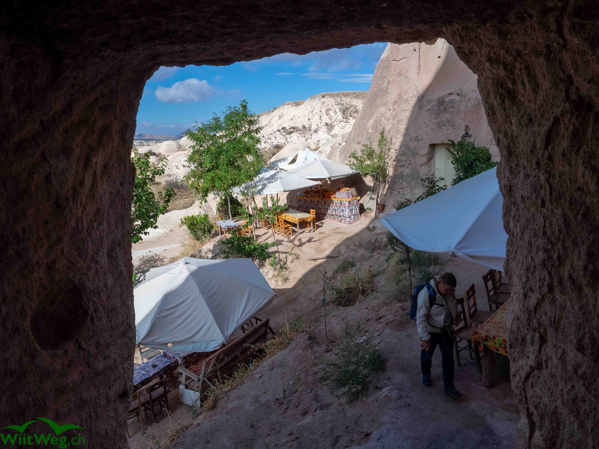 Und nochmals verlegen wir unseren Übernachtungsplatz, diesmal nach Cavusin und erleben dann am Morgen das für Göreme so typische Ballon-Spektakel. Gleichentags unternehmen wir dann eine Wanderung, die uns auch zu einem "Bergrestaurant" führt.